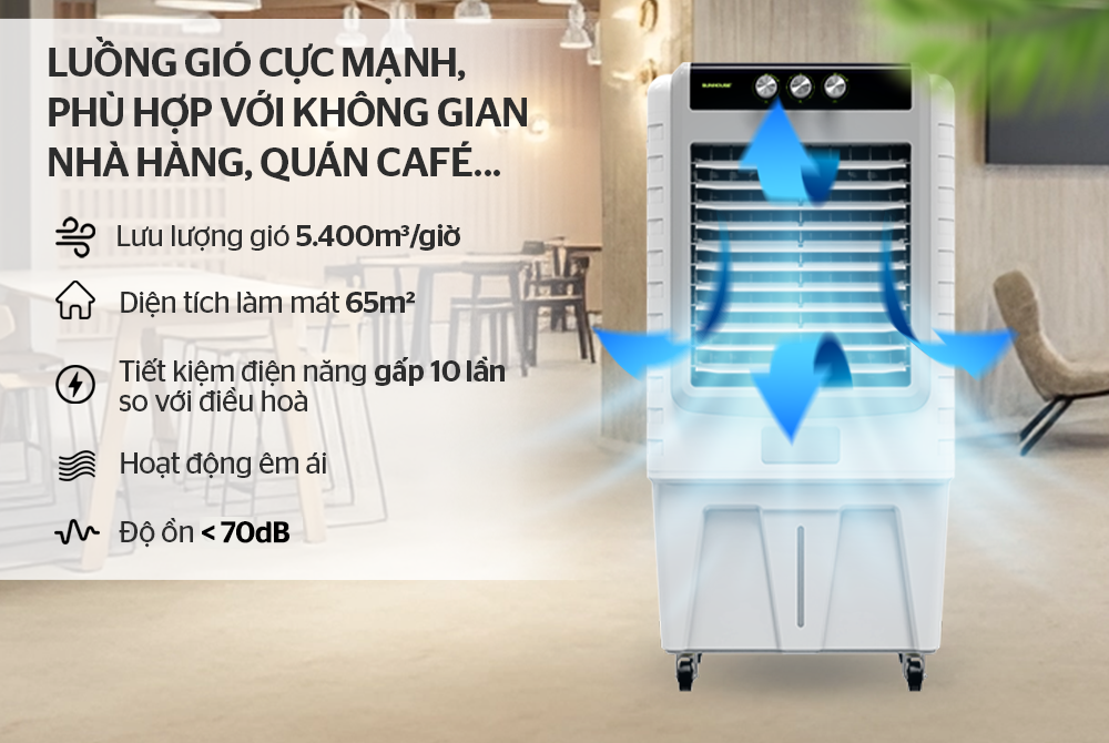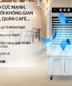 Sản phẩm cho lưu lượng gió lên đến 5.400m3/ giờ, kết hợp chức năng đảo gió tự động (trái – phải), cho phép mở rộng phạm vi làm mát lên tới 65m2. Những diện tích phù hợp sử dụng sản phẩm là nhà hàng, quán ăn, quán café…