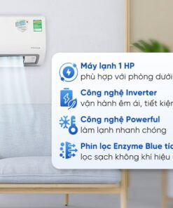 – Công nghệ Inverter – điều chỉnh vòng quay máy nén linh hoạt theo mức tải nhiệt, giúp máy vận hành ổn định, tiết kiệm điện đáng kể so với máy không Inverter.