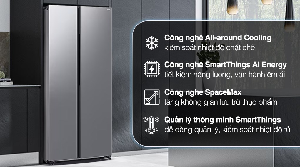 Tủ lạnh Samsung Inverter 583 lít Side By Side RS57DG400EM9SV là lựa chọn hợp lý cho không gian bếp rộng rãi, hiện đại và sang trọng, phục vụ tốt cho nhu cầu của gia đình có trên 5 thành viên. Đây cũng là mẫu tủ lạnh Side by Side tiết kiệm điện với công nghệ SmartThings AI Energy và máy nén AI Inverter. Song song đó là các tiện ích như làm lạnh và đông nhanh, chuông báo khi quên đóng cửa và mở rộng không gian lưu trữ SpaceMax.
